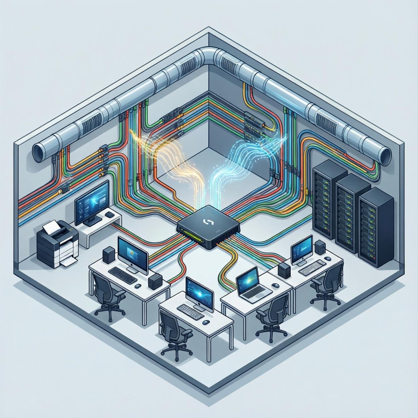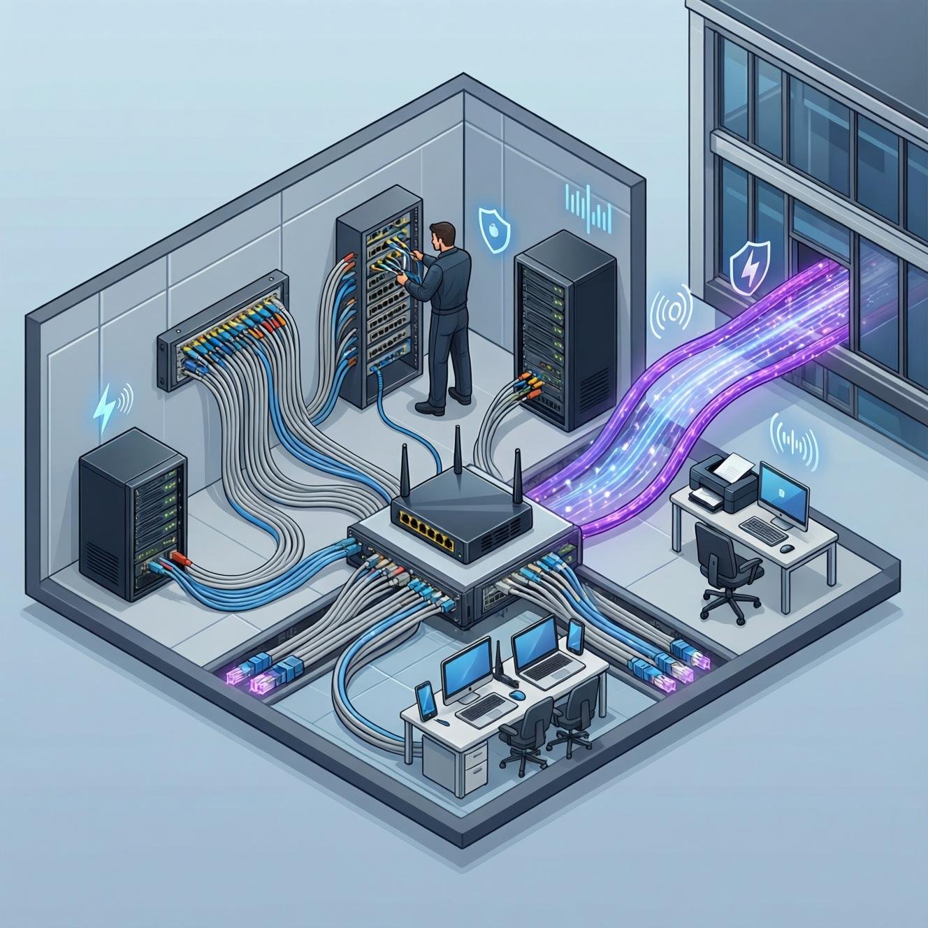Structured CAT6 and Fiber cabling for seamless LAN/WAN connectivity.